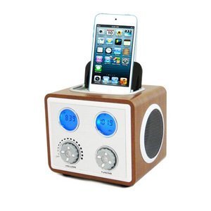 This portable MP3 speaker features a classic retro design with a AM/FM tuner, clock display, alarm and auxiliary input. The IF-C0006 occupies minimal desk and shelf space. Compatible with all MP3 players and iPod/iPhone. This great little retro cube radio allows you to listen to your favorite music anywhere anytime. * AM/FM radio * Alarm clock with radio or buzzer * Portable audio ready-just plug in any audio device such as iPod/iPhone or any MP3 player. * Operates with 4 x AA batteries. Measures 4" x 4" x 3-1/2"